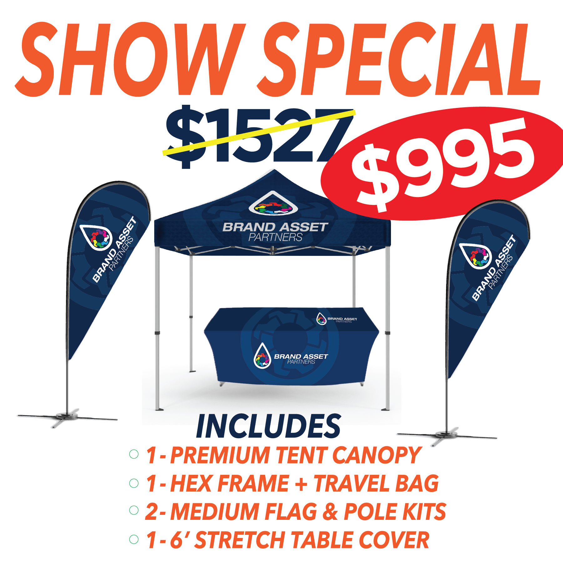 FOR THE FIRST TIME IN THE HISTORY OF BRAND ASSET PARTNERS, WE ARE OFFERING THE ULTIMATE SHOW SPECIAL. THIS IS NOT A MISTAKE, IT IS SIMPLY YOUR OPPORTUNITY TO GET THE #1 INDUSTRY TENT, TABLE COVER AND 2 MEDIUM FLAGS AT A SERIOUS DISCOUNT! TO BUY NOW…CLICK THE BUTTON!